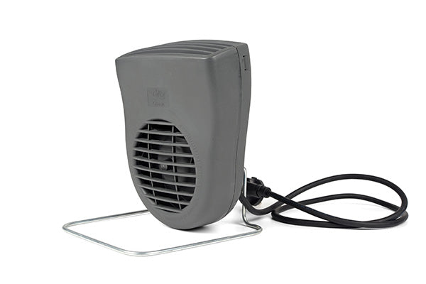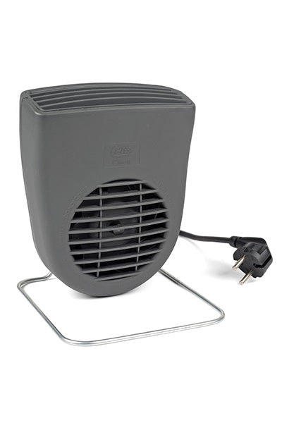 Kupévärmare med ett effektläge 1200W vid - 25°C och vanlig 230V stickkontakt. Sänker effekten allteftersom omgivningstemperaturen stiger. Monteras stående på golvet med bifogad ställning.