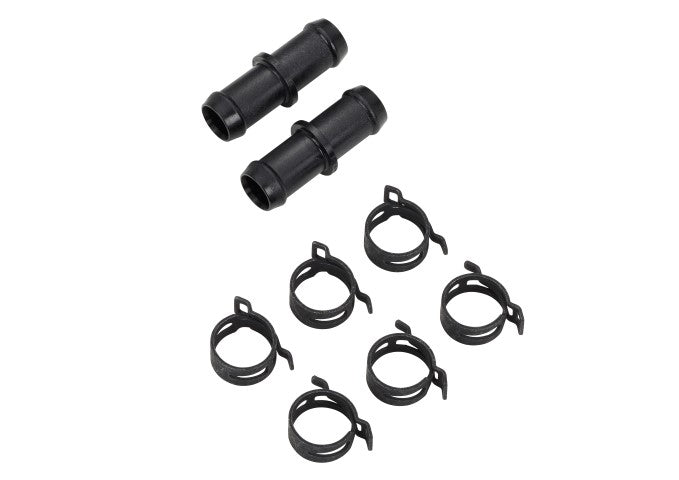 Skarvrör med yttermdiameter på 18 mm. Satsen innehåller två raka skarvrör samt 6 stycken fjäderbandsklammer.
